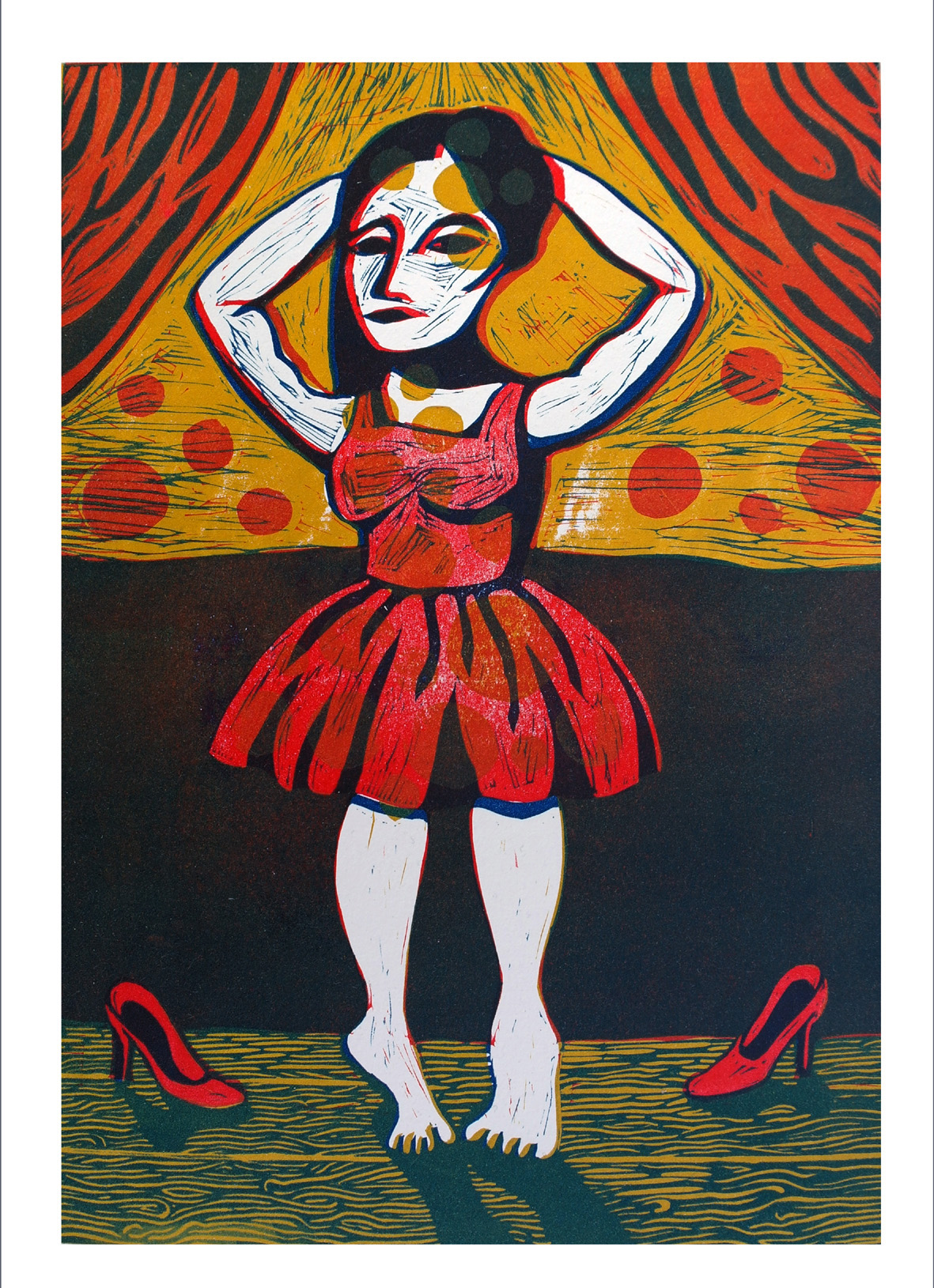 Prints by  me and other Double Elephant Print Workshop members are on sale in the shop at the Thelma Hulbert Gallery in Honiton, including this 3 colour lino print called Red Dress.